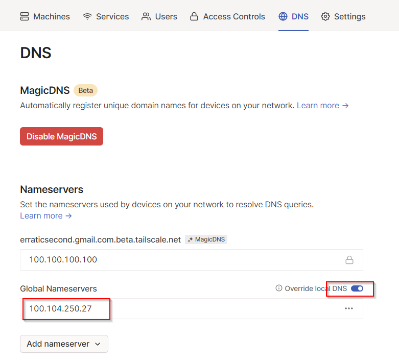 Finally, turn on MagicDNS (if it’s not on already), add your Pi-hole tailnet IP address (100.104.250.27 in my example) to your list of Global Nameservers and toggle Override local DNS.