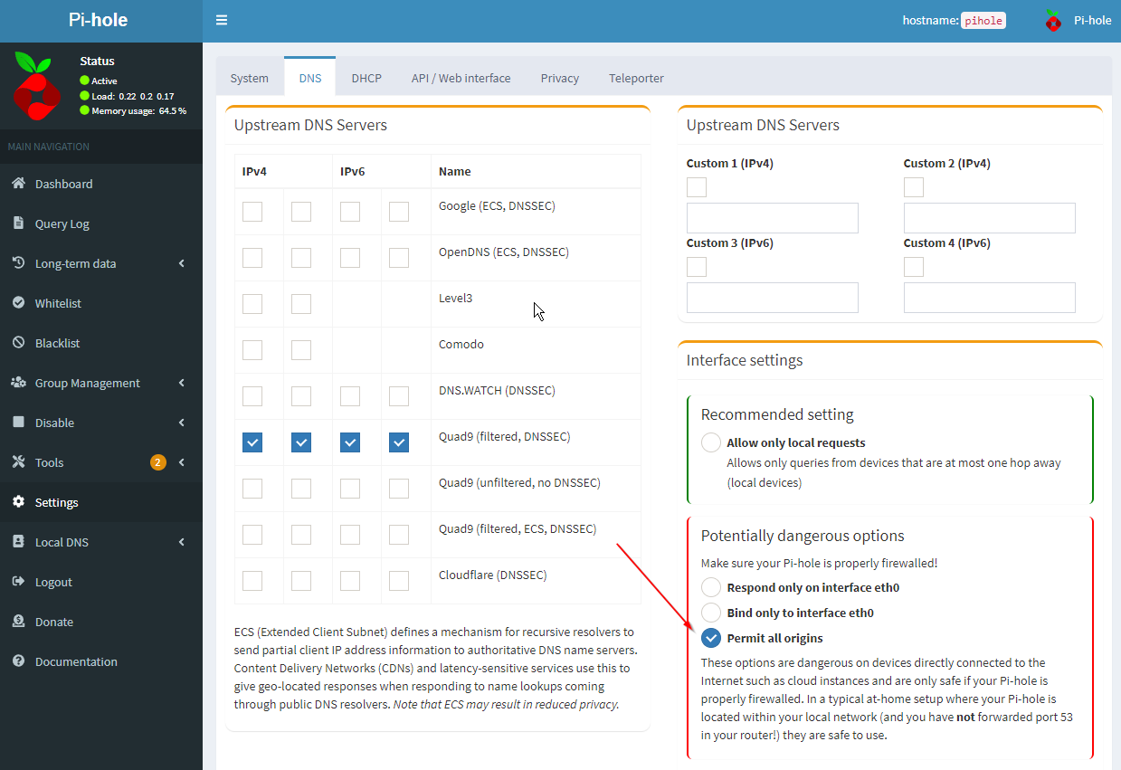 You should now be able to connect to your Pi-hole instance over your tailnet http://pihole/admin and configure it (using the password in your configured password). Make sure to adjust it to permit requests from all origins (safe since this thing is only accessible to your machines on your tailnet).