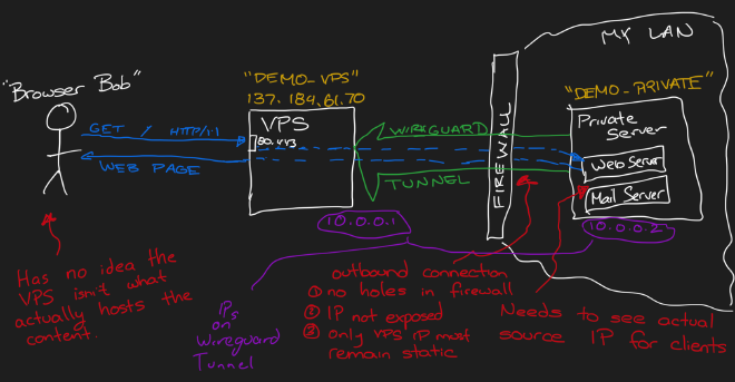 Fortunately, with some not-so-complicated firewall magic, we can forward those packets right through our Wireguard tunnel so that they hit our “demo_private” machine with the correct source IP intact. When “demo_private” replies, those replies will go back through that tunnel, ensuring that the source IP the visitors see is that of “demo_vps”.