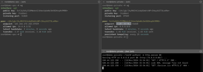At this point, after running sudo wg-quick up wg0 on “demo-private”, we should have a working tunnel.