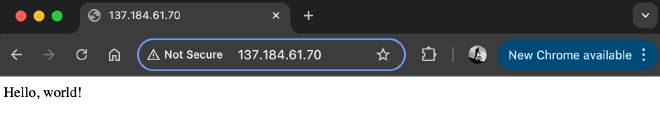 Running wg on either machine should show an established tunnel, and if I hit my VPS IP in the browser http://137.184.61.70, I’ll see my “Hello, World” page.