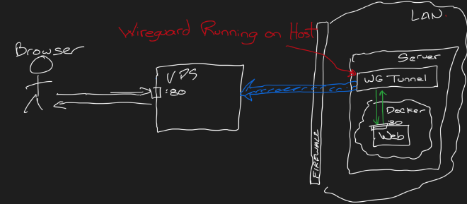 This example gets me the closest to what I love about Cloudflare tunnels. Assuming all my containers are storing their data in the local directory (my strong preference for vs. using Docker volumes) this means I can move this folder (containing docker-compose.yml, wg0.conf and all my container data) to any host running docker, start it up, and they’ll connect to my VPS, and everything will work!