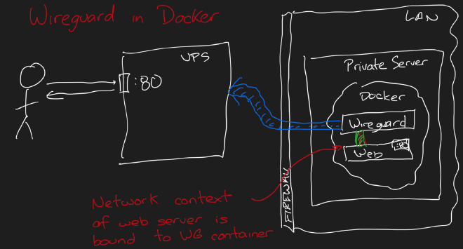 wg0.config. - The most important part is that we are tying the network context of our web server to the Wireguard container. This means that our web server is essentially listening on port 80 of that Wireguard container, so when we’re forwarding traffic to 10.0.0.2:80, it #JustWorks. If we had multiple services (say SMTP, SMTPS, IMAP, …) spread across multiple containers in the same