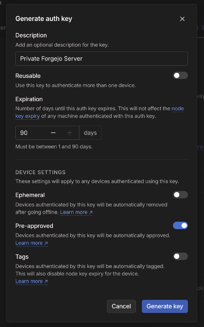 First, let’s generate a new TS Auth Key from the Tailscale UI (Settings > Keys).