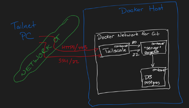 Here is my starting docker-compose.yml. Notice that it defines containers for “tailscale”, “server” (Forgejo) and “db” (Postgres). While it is certainly possible to install Tailscale on the host machine, and share various Docker containers from there, I prefer to connect each container individually to Tailscale so that each container has a nice name on my Tailnet like git.XXX.ts.net instead of server.XXX.ts.net:1234. Attaching each container individually to the Tailnet also makes them portable between hosts (i.e. I can move the whole folder to a new machine, docker compose up and it’ll just work)!
