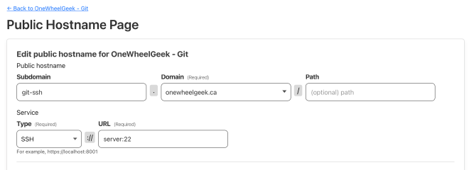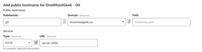 Next, you’ll add a public hostname for your git server, such as git.onewheelgeek.ca. Your name will vary here, but make sure to point it to server:3000 to match the configuration in the docker scripts.