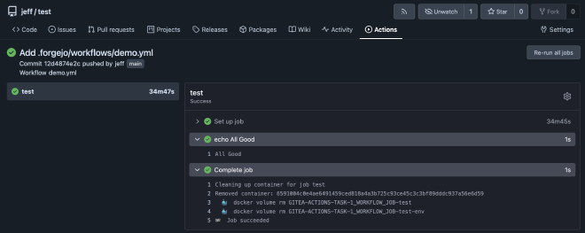 And you can test it out by creating a new repo and adding a file .forgejo/workflows/demo.yml: (for now, it’s probably easiest to do this from the New File button in the Web UI)